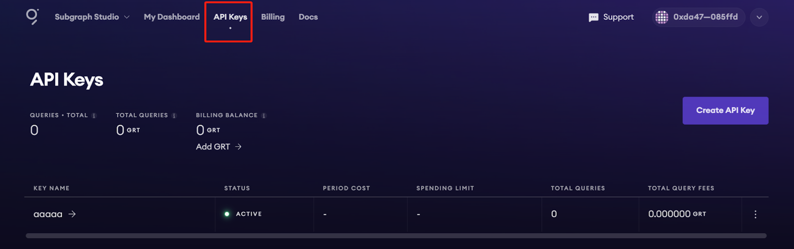 In Subgraph Studio, you’ll see the “API Keys” menu at the top of the page. Here you can create API Keys.